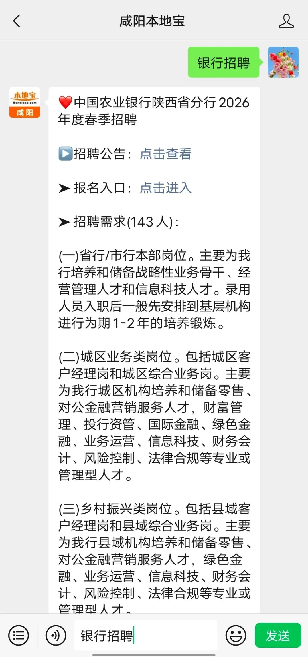 温馨提示:您也可扫描下方二维码,进入【咸阳本地宝】公众号,在聊天框回复【银行招聘】,即可快速进入报名入口并查看详细招聘公告。