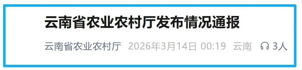 3月13日,云南省农业农村厅官微发布情况通报,内容如下: