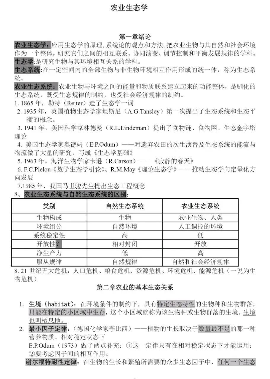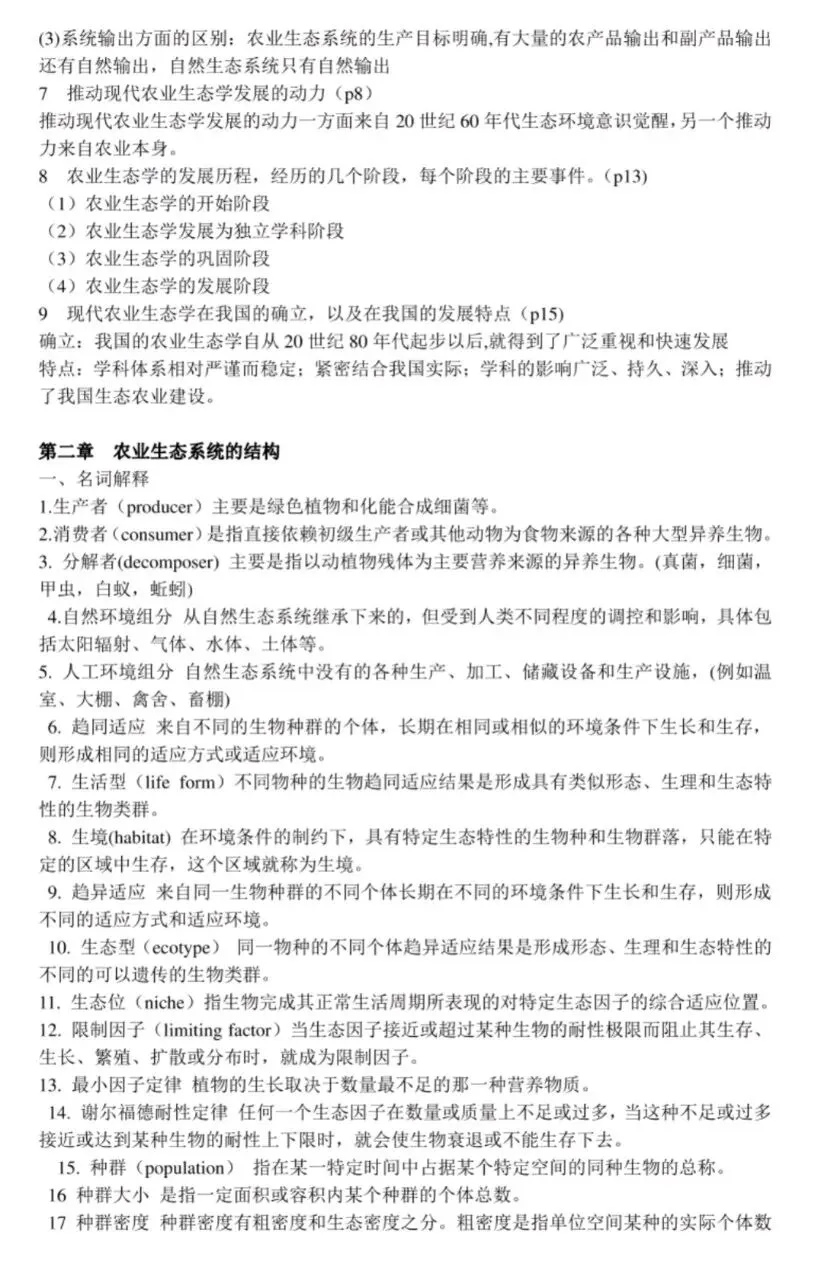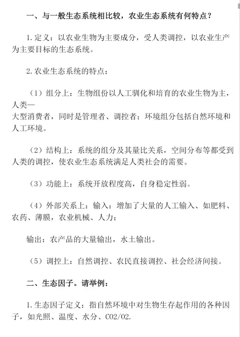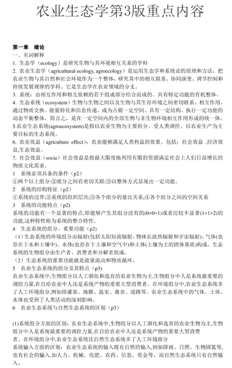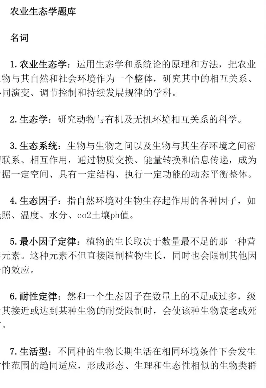 今天分享的是农业生态学骆世明第三版重点笔记 知识点总结+题库及答案复习资料 以下是资料目录及部分内容