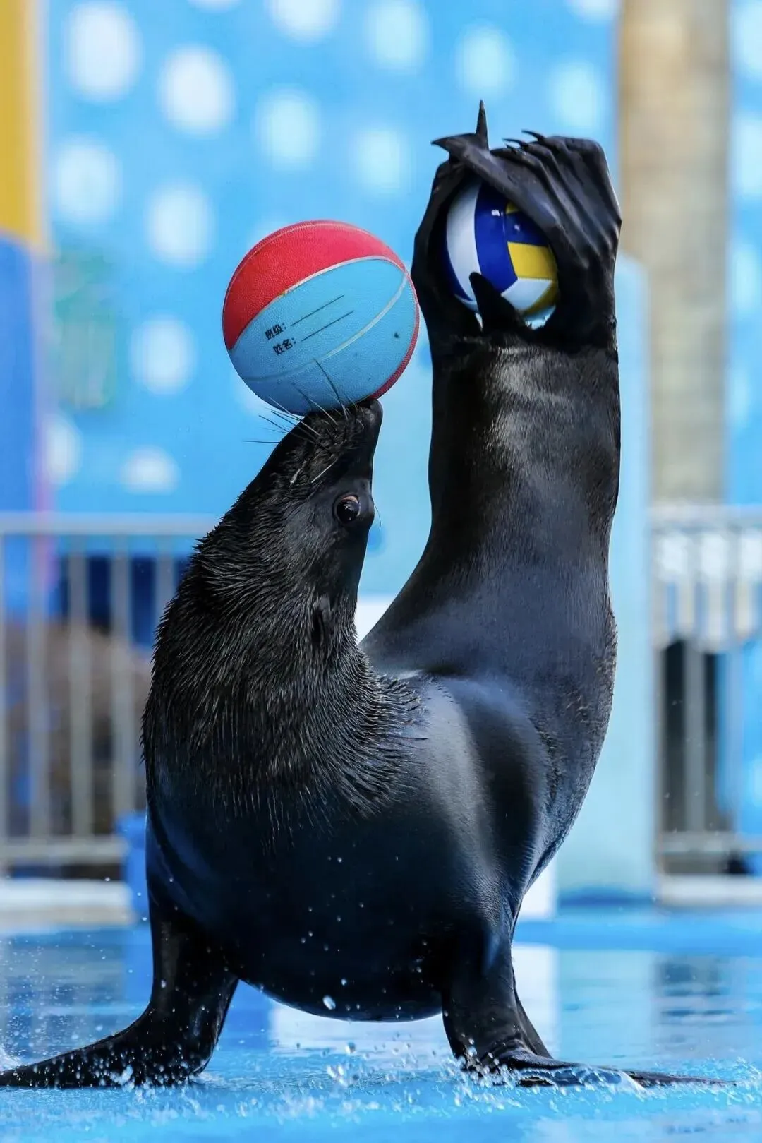 打招呼,亲吻,站立,握手跳跃,摇呼啦圈,顶球学人走路,倒立行走,顶球等等