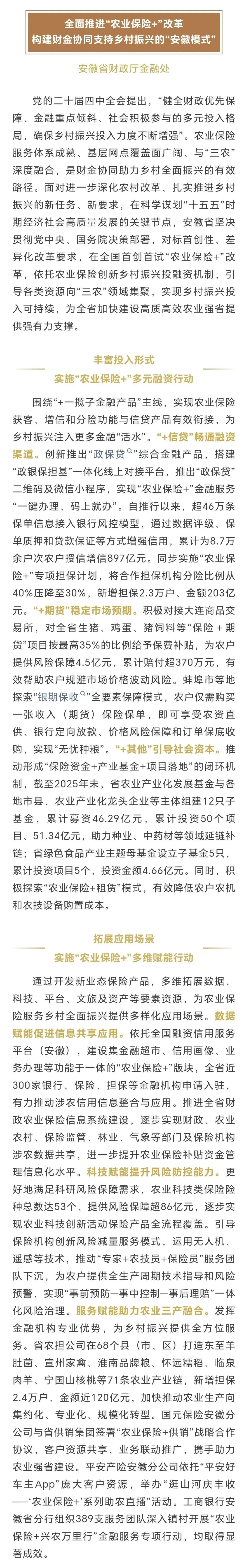 农业保险+ | 安徽省财政厅金融处:全面推进“农业保险+”改革 构建财金协同支持乡村振兴的“安徽模式”