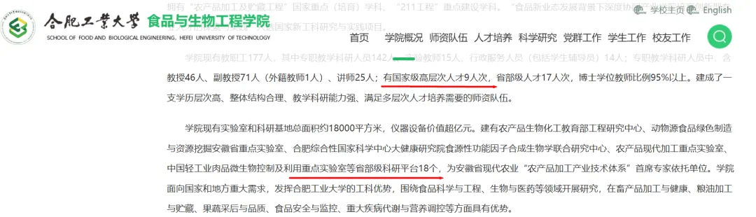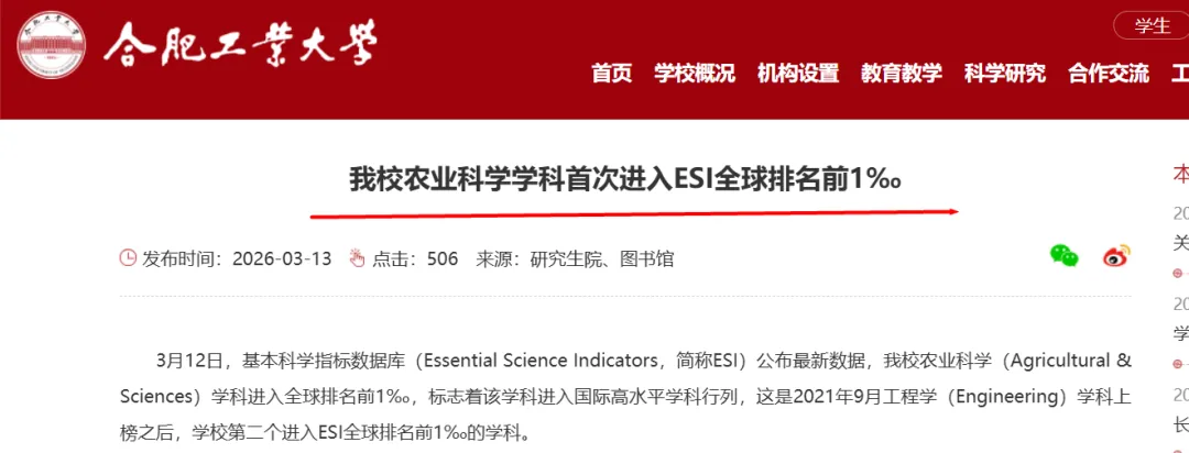 合工大建有食品与生物工程学院,拥有食品科学与工程一级学科博士点,“农产品加工及贮藏工程”是国家重点(培育)学科,在畜产品加工与健康、粮油加工与贮藏、果蔬采后与品质、食品安全与监控等领域形成鲜明特色,并建有农产品生物化工教育部工程研究中心、合肥综合性国家科学中心大健康研究院食源性功能因子合成生物学联合研究中心等省部级科研平台18个,2025年卸任的郑磊校长就是食品科学领域的专家。其能进入农业科学千分之一学科就可以理解了。