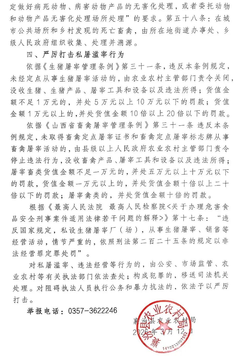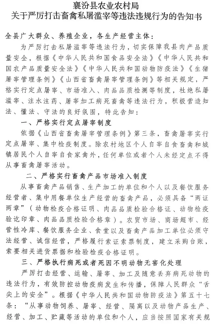 >襄汾县农业农村局关于严厉打击畜禽私屠滥宰等违法违规行为的告知书