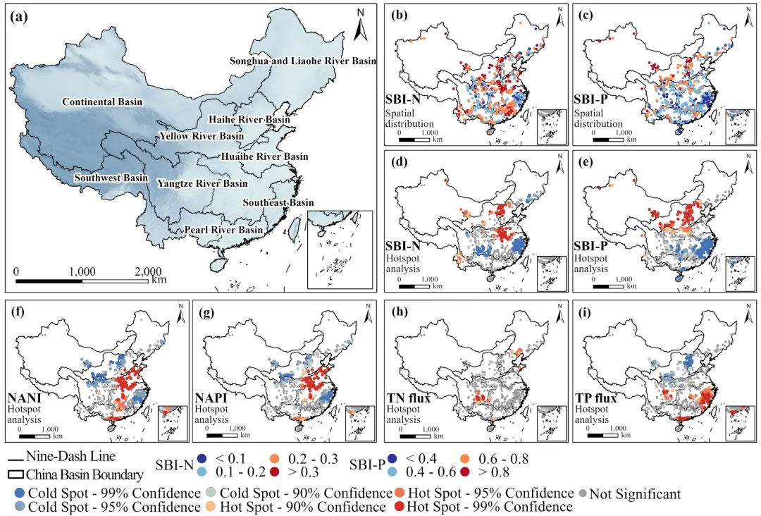 中国九大流域氮磷缓冲指数(SBI-N/SBI-P)、人为氮磷输入量(NANI/NAPI)、氮磷输出通量的空间分布与热点分析