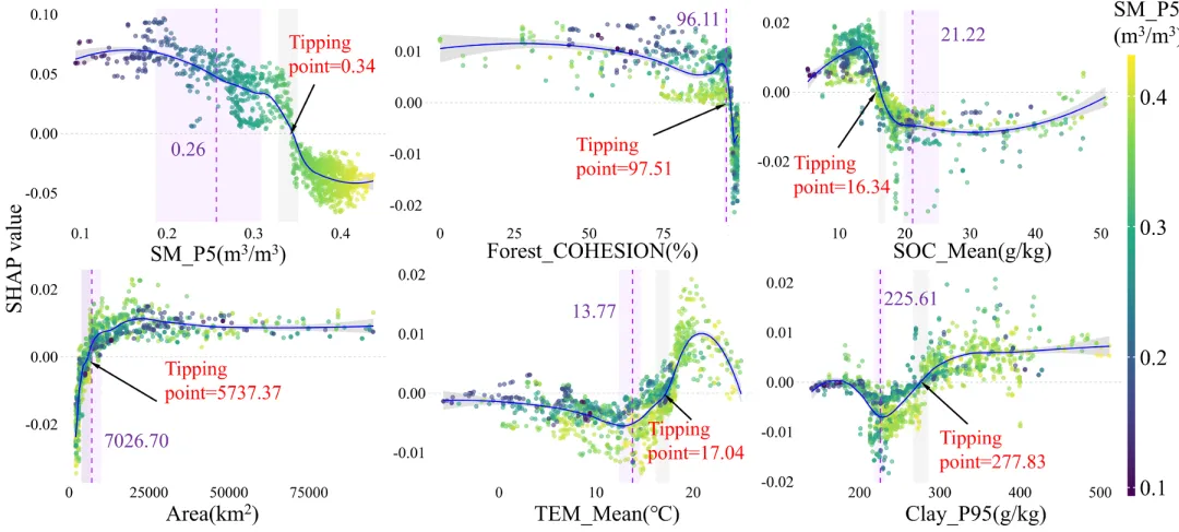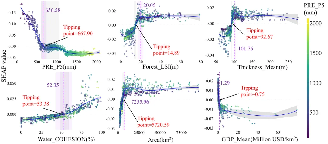 土壤水分、森林斑块凝聚度、土壤有机碳、流域面积、温度、黏土含量等对氮缓冲能力的影响存在非线性阈值,超过临界点后作用方向或强度突变;降水、森林景观形状指数、土壤厚度、水域凝聚度、GDP 等对磷缓冲能力的调控同样存在临界区间,是流域精准管控的关键参考值。