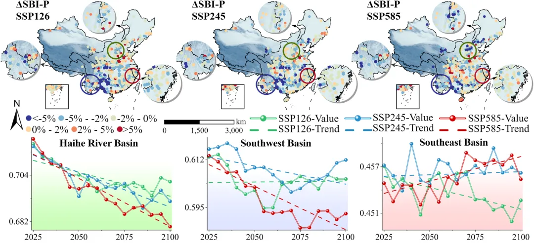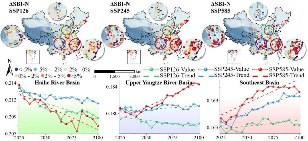 在 SSP126、SSP245、SSP585 三种未来情景中,41%~55% 的流域氮缓冲能力将下降,84%~87% 的流域磷缓冲能力将下降,磷缓冲能力衰退风险远高于氮。空间上,北方流域氮缓冲能力下降更显著,西南与东南流域磷缓冲能力降幅突出,高排放情景(SSP585)下流域缓冲能力退化风险进一步加剧。