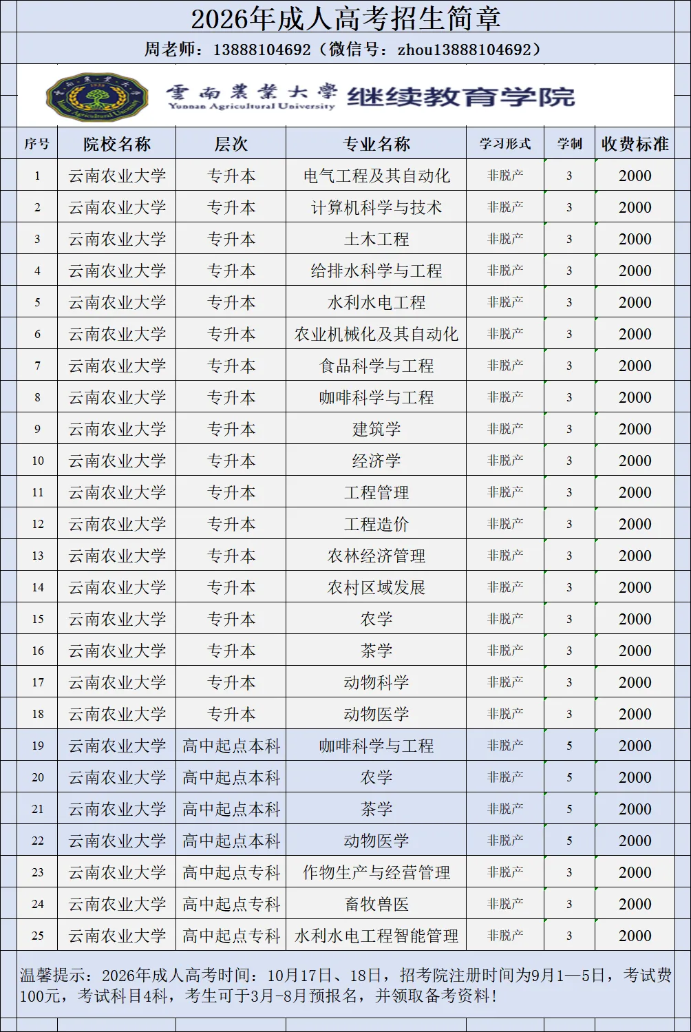 >云南农业大学继续教育学院2026年成人高考招生简章