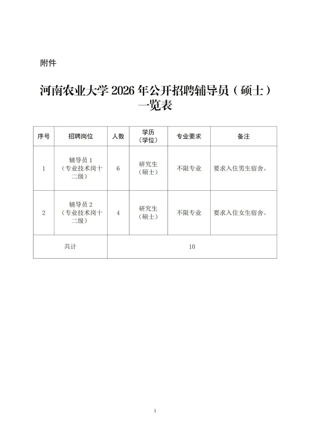 详见附件《河南农业大学2026年公开招聘辅导员(硕士)一览表》。