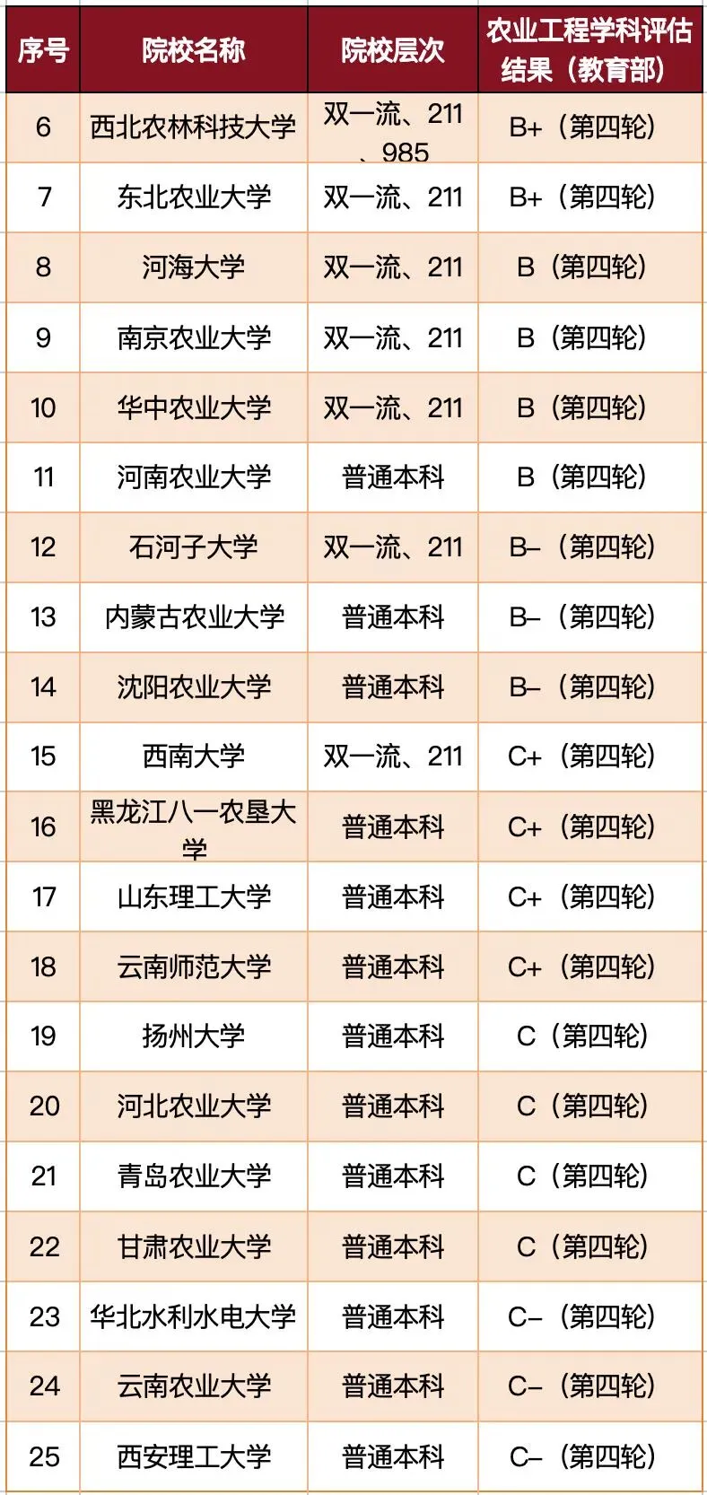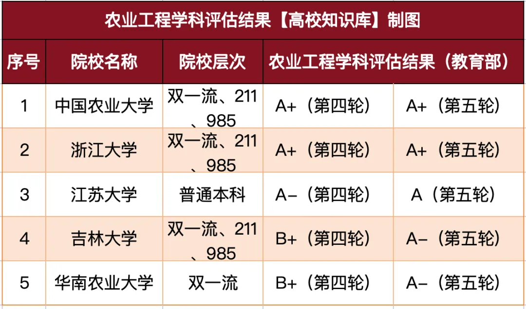 教育部第五轮学科评估未向社会公开,但根据各校透露以及参考网络信息,已统计有5所大学的农业工程学科在第五轮获评A-及以上,中农、浙大2校获评A+,并列第一梯队。中国农业大学工学院系源于上世纪50年代初期北京农业机械化学院创办农业机械设计制造专业和农业机械化专业,以曾德超院士为主要代表的老一代知名专家教授为学院的奠基与发展做出了卓越贡献。共建有智能农业动力装备全国重点实验室,农业工程学科目前是该一级学科全国唯一的国家重点学科、两所入选“双一流”建设学科的大学之一。