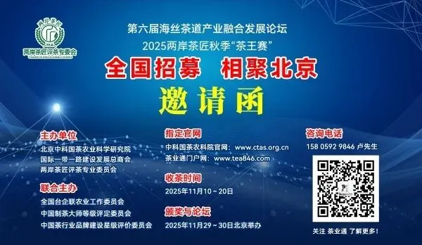 “茶王赛”主办方北京中科国茶农业科学研究院执行院长、两岸茶匠评茶专业委员会执行主任卢劲向记者介绍,本届茶赛11月10日至20日收茶样,分别寄往北京、厦门两地赛区评审比赛,11月29~30日在北京举办第六届海丝茶道产业融合发展论坛暨2025两岸茶匠秋季“茶王赛”颁奖盛典与论坛峰会。届时将有主管部门领导、专家学者等莅临峰会,围绕着茶产业高质量发展、品牌建设、文化塑造、产销渠道、数字化与资本赋能及产业升级、异业联盟等议题展开探讨,共谋茶产业发展的新路径与新机遇。峰会现场还将有优质项目对接、推介和商务活动等,近期申报等级评定、茶行业星级评价入围的“中国制茶大师”“星级品牌茶企”及本届“茶王赛”茶王、金奖和部分特等奖、一等奖获得者,“岀彩茶艺”网络大赛入围者以及受聘“茶文化推广专员”等将同台授牌颁奖。