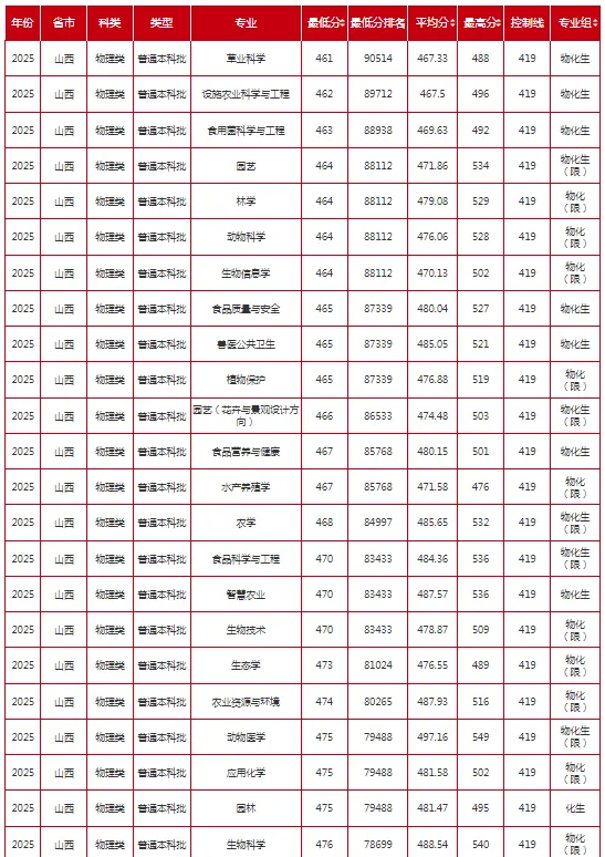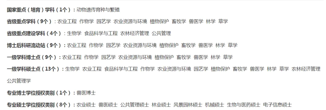 山西农业大学(山西省农业科学院)是我国著名高等农业学府,教育部本科教学评估优秀高校,山西省政府与农业农村部共建高校,全国首批深化创新创业教育改革示范高校,国家中西部基础能力建设入选高校山西农业大学始建于1907年创办的私立铭贤学堂,后发展为私立铭贤农工专科学校、私立铭贤学院;1951年改私立为公办,成立山西农学院;1979年更名为山西农业大学,成为改革开放初全国99所重点大学之一。现有8个博士后科研流动站,9个博士学位授权一级学科,1个博士专业学位授权类别;13个硕士学位授权一级学科,8个硕士专业学位授权类别。现有动物遗传育种与繁殖1个国家重点(培育)学科,农业工程、作物学、园艺学、农业资源与环境、植物保护、畜牧学、兽医学、林学、草学等9个省级重点学科。植物学与动物学、农业科学、环境与生态科学三个学科进入ESI全球前1%。农学院经过近百年的发展,学院形成了本、硕、博“三位一体”的多层次教育体系。现有农学、农学(功能农业方向)、种子科学与工程、智慧农业4个本科专业(方向),本硕统筹班1个,公费农科生班1个。农学专业为国家一流专业建设点、国家特色专业、省级品牌专业和优势专业;种子科学与工程专业为省级一流专业。有作物学一级学科博士学位授权点和博士后科研流动站,作物栽培学与耕作学、作物遗传育种学2个二级学科博士点和5个硕士学位授权点。植物保护学院植物保护专业为国家级一流专业建设点、国家级特色专业、国家首批卓越农林人才教育培养计划改革试点(拔尖创新型)、山西省品牌专业;动植物检疫(植物检疫方向)专业为山西省一流专业建设点;生物农药科学与工程专业为教育部2020年首个批准设立的植物生产类目录外新型农科专业,率先开启了我国生物农药本科人才的培养。植物保护专业实施分类培养,开设有本硕统筹班、卓越人才实验班、普通班和公费农科生班动物科学学院拥有畜牧学博士后科研流动站,畜牧学一级博士学位授权学科(下设4个研究方向),畜牧学一级硕士学位授权学科(包含二级硕士学位授权点4个)以及动物科学(包括本硕统筹培养)和经济动物学两个本科专业。畜牧学科是山西省“优势学科攀升计划”和“1331工程”统筹推进“双一流”建设重点学科。二级学科中,动物遗传育种与繁殖为国家重点培育学科。动物科学专业为国家级一流专业、山西省特色专业和山西省品牌专业动物医学学院现有动物医学专业(本硕统筹培养)、动物医学、动植物检疫(动物检疫方向)、兽医公共卫生等本科专业,其中动物医学专业列入首批国家级一流本科专业建设点、国家级特色专业、省级品牌专业和省级优势专业。学院第一批次招生的专业为动物医学(本硕统筹培养),学制7年草业学院草业科学专业入选“国家一流本科专业建设点”。草业科学硕士学位授权点,草业领域农业推广硕士专业学位(现为农艺与种业专业草业方向)研究生授权点,饲料作物生产与利用二级博士授权点,草学一级硕士授予点,获草学一级博士授予点,获批草学博士后科研流动站。资源环境学院有农业资源与环境一级学科博士学位授权点、公共管理一级学科(土地资源管理方向)硕士学位授权点、农业资源利用与植物保护硕士专业学位授权点、资源与环境硕士专业学位授权点(工学),设有院士工作站、农业资源与环境博士后流动站。环境与生态科学学科进入ESI全球前1%,农业资源与环境学科进入“2023软科中国最好学科排名”前30%。学院拥有农业资源与环境(国家级一流专业建设点、国家级特色专业)、土地资源管理(国家级一流专业建设点),建成覆盖本科、硕士、博士三级学位教育及博士后流动站的完整人才培养体系园艺学院拥有园艺学一级学科硕士学位授权点、博士学位授权点和博士后科研流动站;,园艺专业为国家级一流专业建设点、教育部卓越农林人才教育培养计划改革试点专业、国家特色专业食品科学与工程学院有食品科学与工程一级学科硕士学位授权点和农业硕士(食品加工与安全领域)、生物与医药(食品工程)2个专业硕士学位授权点,食品资源与营养工程交叉学科博士点。。食品科学与工程连续三年进入软科中国最好学科排名前30%,食品科学与工程(国家级一流本科专业建设点)、食品质量与安全(国家级一流本科专业建设点)农业经济管理学院有农林经济管理一级学科硕士学位授权点1个,拥有农村发展和农业管理两个农业硕士专业领域。农业工程咨询、国土规划、农业项目评估验收的国家级及省级咨询资质和资格单位生命科学学院生物学硕士一级学科授权点和农艺与种业生物农业方向授权点,生物科学国家一流本科专业建设点,中药资源与开发,生物技术为省级一流本科专业建设点,生物科学开设了1本A类卓越班招生培养。已建立起完整的本科生、硕士研究生人才培养体系林学院形成了本科、硕士、博士林科人才培养体系以及博士后流动站工作平台。设有林学、林学(森林康养方向)、园林、水土保持与荒漠化防治、生态学等4个本科专业。林学为国家一流本科专业建设点,园林和水保为省一流本科专业建设点农业工程学院构建了本科生、硕博士研究生教育为一体的多层次人才培养体系。学院拥有农业工程一级学科博士学位授权点、农业工程一级学科硕士学位授权点、机械硕士专业硕士