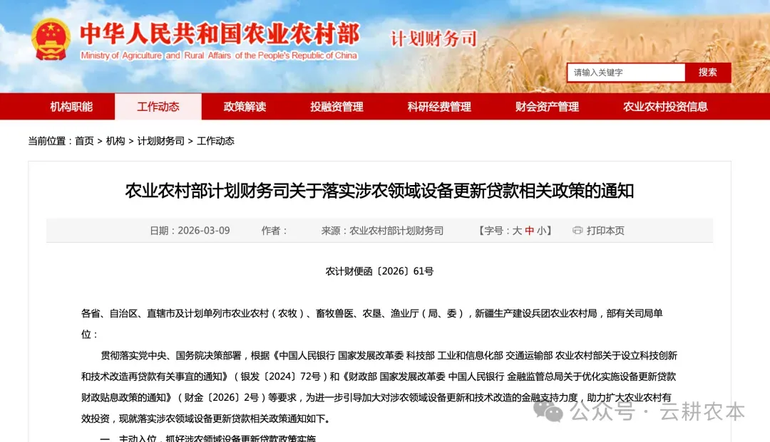贯彻落实党中央、国务院决策部署,根据《中国人民银行 国家发展改革委 科技部 工业和信息化部 交通运输部 农业农村部关于设立科技创新和技术改造再贷款有关事宜的通知》(银发〔2024〕72号)和《财政部 国家发展改革委 中国人民银行 金融监管总局关于优化实施设备更新贷款财政贴息政策的通知》(财金〔2026〕2号)等要求,为进一步引导加大对涉农领域设备更新和技术改造的金融支持力度,助力扩大农业农村有效投资,现就落实涉农领域设备更新贷款相关政策通知如下。