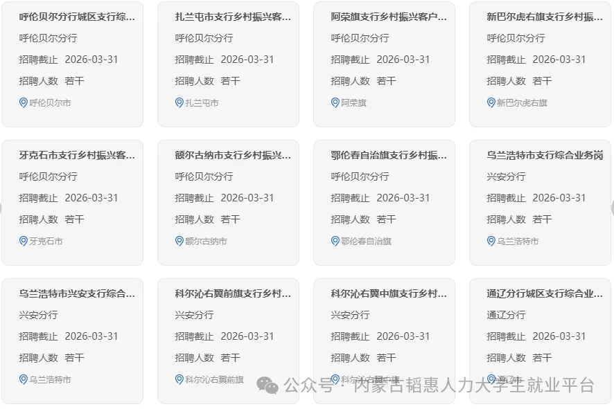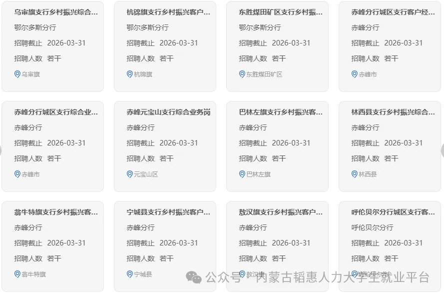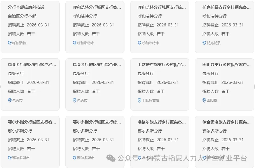 中国农业银行内蒙古自治区分行是中国农业银行股份有限公司辖属一级分行,深入践行金融工作的政治性和人民性,以高质量党建引领高质量发展,立足服务乡村振兴领军银行、服务实体经济主力银行定位,全面实施“三农”普惠、绿色金融、数字经营三大战略,聚焦金融“五篇大文章”,全力支持内蒙古完成好习近平总书记赋予内蒙古的五大重要战略定位和任务使命,服务保障“模范自治区”高质量发展,为谱写中国式现代化内蒙古新篇章贡献农行力量。现面向境内外高校招聘优秀大学毕业生,有关招聘事宜公告如下: