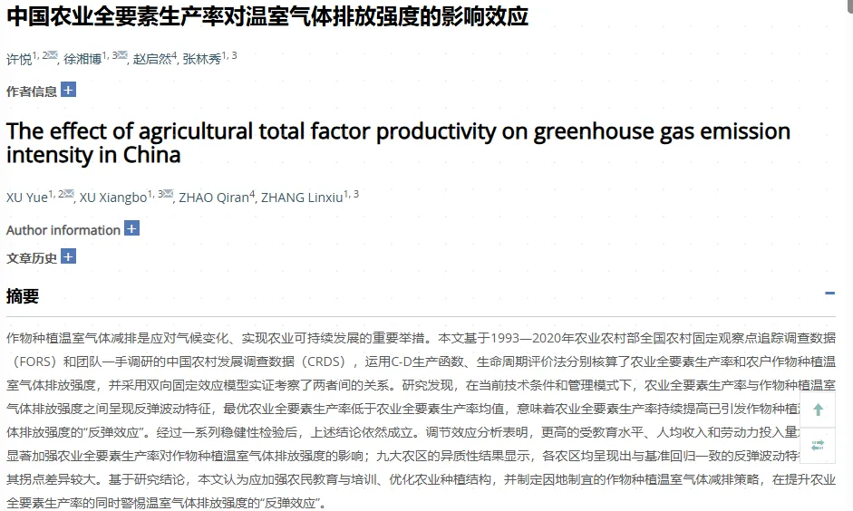 题目:《中国农业全要素生产率对温室气体排放强度的影响效应》发表期刊:《地理学报》