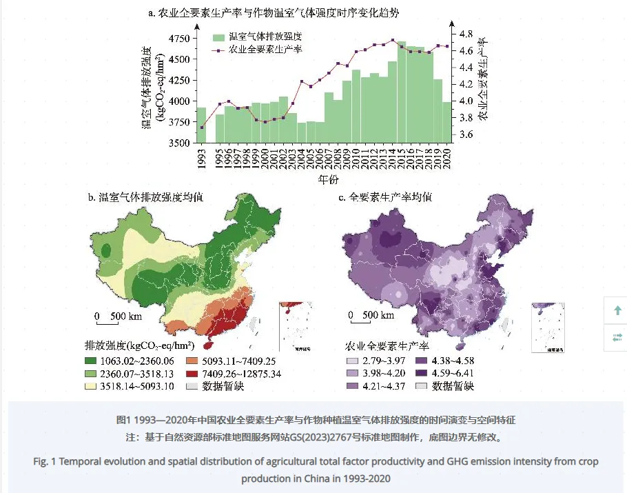 时序:1993-2020 年农业全要素生产率整体波动上升(增幅约 23.36%);作物种植温室气体排放强度先升后降,2015 年达峰值后因化肥农药零增长行动呈下降趋势。