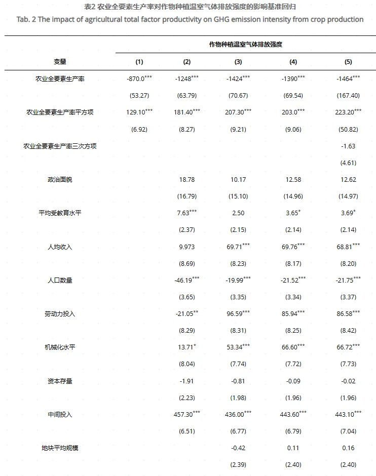 2.1 农业全要素生产率对作物种植温室气体排放强度的影响
