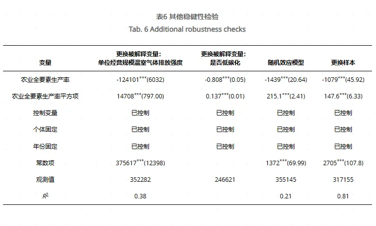 摘要:作物种植温室气体减排是应对气候变化、实现农业可持续发展的重要举措。本文基于1993—2020年农业农村部全国农村固定观察点追踪调查数据(FORS)和团队一手调研的中国农村发展调查数据(CRDS),运用C-D生产函数、生命周期评价法分别核算了农业全要素生产率和农户作物种植温室气体排放强度,并采用双向固定效应模型实证考察了两者间的关系。研究发现,在当前技术条件和管理模式下,农业全要素生产率与作物种植温室气体排放强度之间呈现反弹波动特征,最优农业全要素生产率低于农业全要素生产率均值,意味着农业全要素生产率持续提高已引发作物种植温室气体排放强度的“反弹效应”。经过一系列稳健性检验后,上述结论依然成立。调节效应分析表明,更高的受教育水平、人均收入和劳动力投入量均可以显著加强农业全要素生产率对作物种植温室气体排放强度的影响;九大农区的异质性结果显示,各农区均呈现出与基准回归一致的反弹波动特征,但其拐点差异较大。基于研究结论,本文认为应加强农民教育与培训、优化农业种植结构,并制定因地制宜的作物种植温室气体减排策略,在提升农业全要素生产率的同时警惕温室气体排放强度的“反弹效应”。