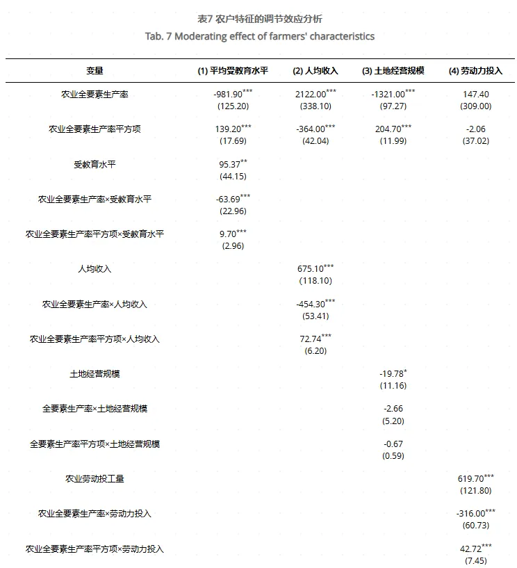 农户受教育水平、人均收入、劳动力投入对二者关系具有显著正向调节作用,土地经营规模调节效应不显著;