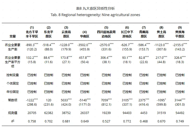九大农区均呈现与基准回归一致的反弹波动特征,但最优全要素生产率拐点差异显著,最高为四川盆地及周边地区(4.19),最低为黄土高原区(2.59),反映各地区农业生产资源、技术、管理的差异。