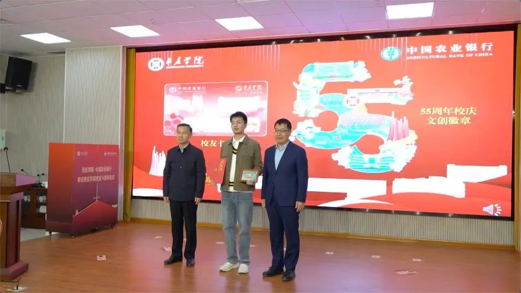 发布仪式上还举行了联名校友卡卡面设计暨校园文创设计大赛颁奖。李品深、袁俊现共同为特等奖获得者、卡面设计师、2021级视觉传达设计专业张怀宇校友颁奖,并为其颁发首张实体校友卡。张怀宇分享了创作感言和对母校的深厚情怀。