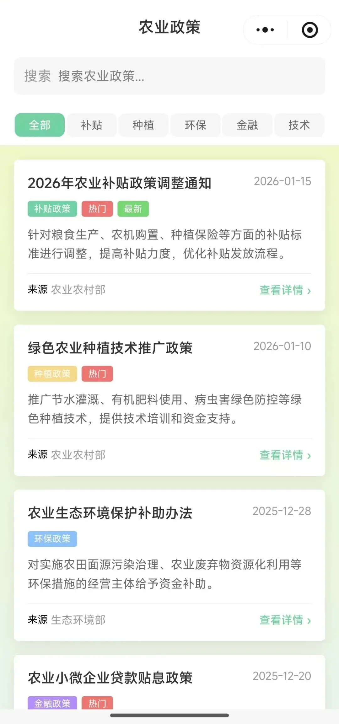 春耕补贴何时申报?农机购置补贴标准是多少?今年有哪些产业扶持项目?这些关系到农户切身利益的政策,往往发布渠道分散、信息碎片化,很多农户要么不知道,要么知道时已经错过了申报窗口期。