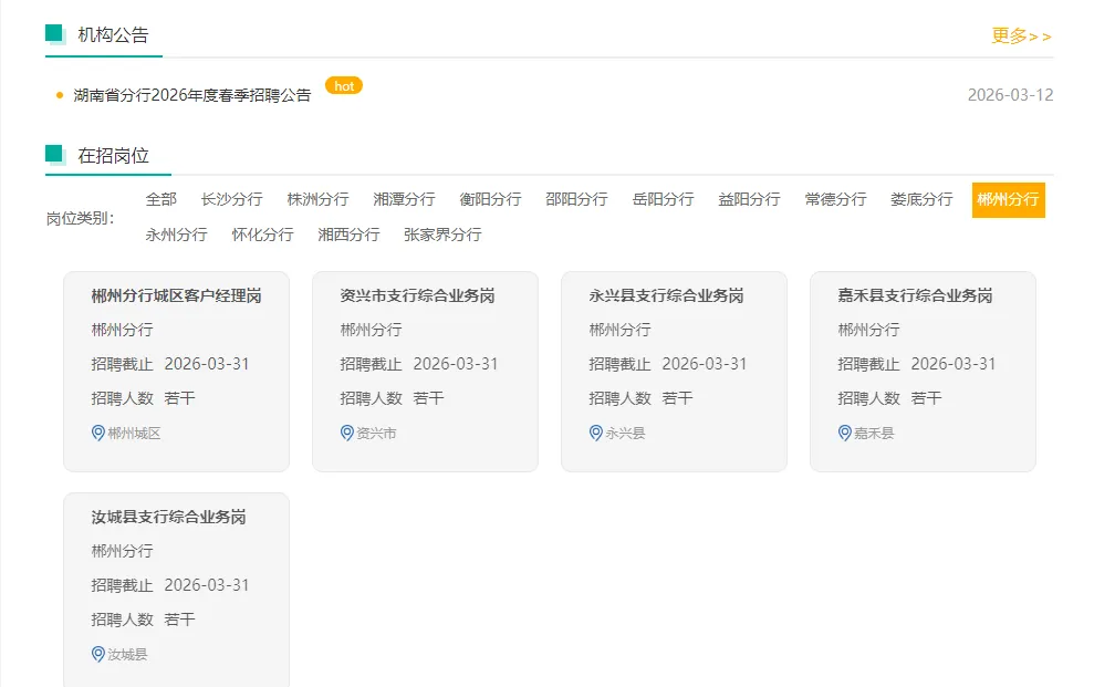 原标题:中国农业银行湖南省分行2026年度春季招聘公告