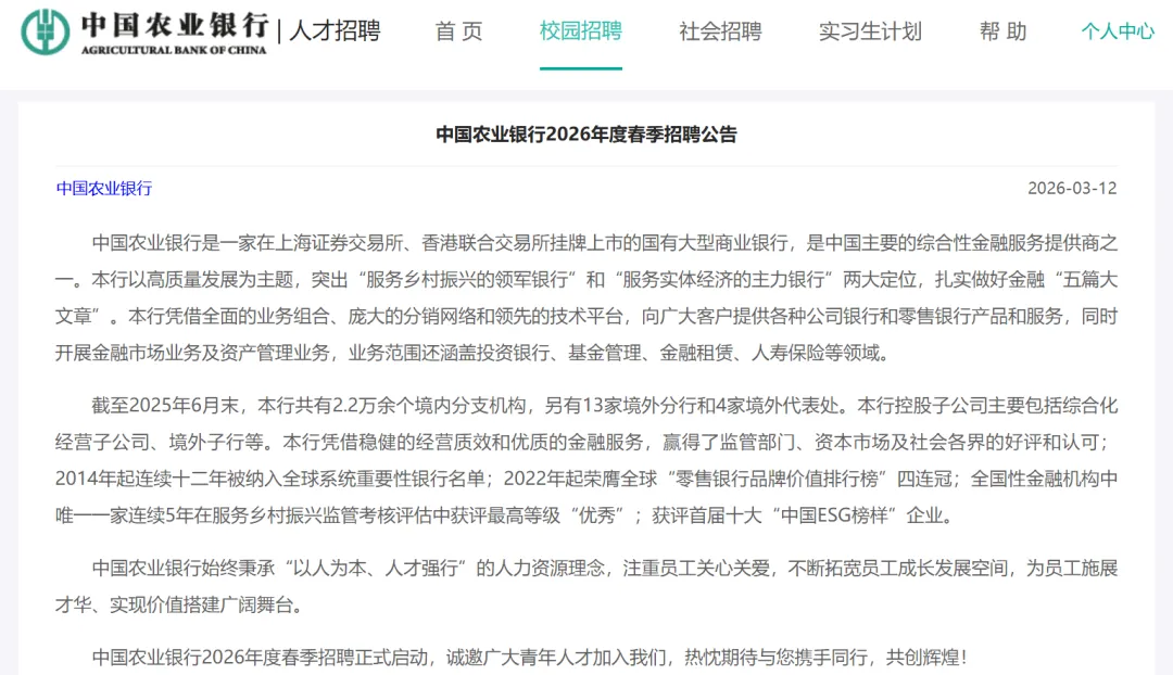 中国农业银行2026年度春季招聘正式启动,诚邀广大青年人才加入我们,热忱期待与您携手同行,共创辉煌!