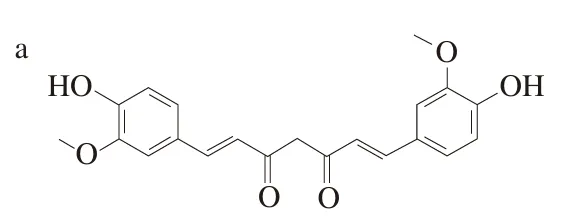 姜黄素又称姜黄色素、酸性黄,是从姜科植物姜黄、莪术、芥末、咖哩、郁金等根茎中提取的一种天然酚类物质,其分子式为C21H20O6,结构式如图1a所示,相对分子质量为368.37,熔点为183 ℃,味稍苦、呈结晶状,是植物界中少有的二酮色素,可用作天然食品添加剂。