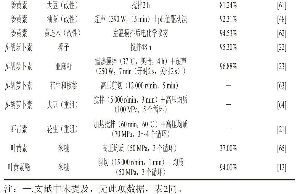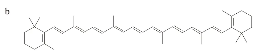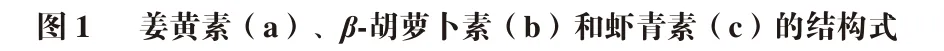 作为一种亲脂性生物活性物质,姜黄素具有抗炎、抗菌、镇痛和抗癌等功效,能够抑制细胞的生长周期进程,诱导细胞凋亡并阻止癌细胞的增殖,因此可以减少肿瘤生长和转移,并对放疗和化疗引起的炎症有明显缓解作用。然而,姜黄素具有半衰期短、生物利用度低、溶解度低和化学性质不稳定等缺点,这导致其在医药及食品上的应用受到限制。基于上述问题,有不少研究都将目标聚焦于姜黄素的增溶技术,主要包括固体分散技术、脂质体技术、包合技术、多重包埋微胶囊技术、乳液凝胶技术等。同时,目前已有研究开始利用大豆、米糠、油茶、油菜等作物的油脂体乳液负载姜黄素,经油脂体包埋后,姜黄素的生物可及性得到了较好的改善。如Huang Ziwei等的研究发现,采用油茶油脂体包埋姜黄素,当姜黄素质量分数为1%时包埋率最大(83.53%),粒径最大(2.17 μm),在NaCl浓度100~500 mmol/L,pH 3、5~9,30~90 ℃条件下显示出良好的稳定性,游离脂肪酸的缓释率达到77.46%,并且姜黄素的生物可及性在模拟肠消化阶段期间持续增加,最终达到81.51%。Zhu Jianyu等的研究中,使用大豆油脂体包埋姜黄素,包埋率达到88.27%,负载率为0.044%,电位为—25.71 mV,较为稳定,并且在经过体外消化过程后,姜黄素生物可及性为57.72%,游离脂肪酸的缓释率达到87.24%。 2.2 类胡萝卜素