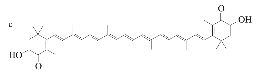 类胡萝卜素是自然界中常见的一类天然色素,是由异戊二烯单元组成的共轭双键长链结构。根据是否含有氧原子,分为胡萝卜素和叶黄素两大类。胡萝卜素只含碳氢元素,具有共轭双键组成的长链结构,是典型的不饱和烃,如α-胡萝卜素、β-胡萝卜素(图1b)和番茄红素等;叶黄素的分子结构中含有氧原子,包括羟基、羰基、羧基等官能团,其种类繁多,如虾青素(图1c)、叶黄素、玉米黄质等。类胡萝卜素具有极强的抗氧化性,可以抑制肿瘤生长、增强免疫力、抵抗紫外线损伤等,因此它被广泛应用于食品、保健品和化妆品中。然而,类胡萝卜素结构中的双键易受氧化剂、光和热的影响,导致其本身稳定性不高,易氧化、见光易分解。并且天然存在的类胡萝卜素为亲脂性,难溶于水,因此难以直接添加到食品体系中,且不易被人体吸收,生物利用度低。针对类胡萝卜素不稳定的缺点,传统方法常利用乳液、纳米颗粒、脂质体等构建负载体系提高其稳定性。有研究表明,亚麻籽油、大豆油等油脂的存在可以提高类胡萝卜素的生物利用度,而这些作物种子内部的油脂体作为天然的油脂储存器,是构建类胡萝卜素功能性食品的理想递送系统。近年来,有研究采用花生油脂体乳液负载虾青素,结果显示相较于对照组,该体系在黑暗条件下贮藏14 d,虾青素的保留率从62.8%显著提高至70.9%。Tian Yan等在研究中对比了椰子、大豆和花生油脂体对β-胡萝卜素的包埋效果,发现椰子油脂体的效果最好,在贮藏第6天时β-胡萝卜素的保留率为87.00%。Zhang Shan等采用温热搅拌和超声协同作用的方法,使用油茶油脂体包埋β-胡萝卜素,发现经过30 d保存后,β-胡萝卜素的包埋率仍保持在84.06%。 2.3 香气物质