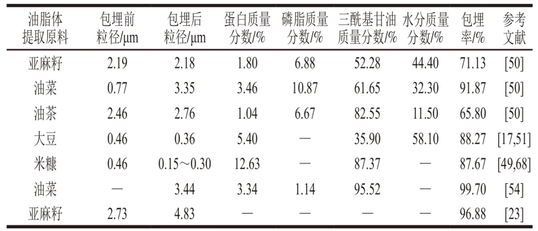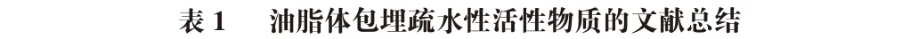 油脂体负载疏水性活性物质的包埋效果和包埋后乳液的稳定性可能和油脂体中蛋白质和磷脂含量、乳液中油相和水相的相对浓度等因素有关,当前的研究结果显示(表2),不同原料、不同提取方法和不同提取条件都会影响最终油脂体的组成,而油脂体中磷脂和蛋白质含量与其包埋率之间存在一定的关系。Zhang Shan等研究发现,油菜油脂体的磷脂和蛋白质含量显著高于亚麻籽油脂体和油茶油脂体,其对姜黄素的包埋率也远高于亚麻籽和油茶油脂体,经Pearson相关分析后,发现上述3 种油脂体的姜黄素包埋率均与膜蛋白含量之间存在强相关性,相关系数为0.984(P<0.01),说明膜蛋白含量越高,包埋姜黄素的效果越好,同时还发现具有高蛋白质含量和高姜黄素负载量的油菜籽油脂体经包埋后界面蛋白质的构象重排程度较高。Sun Yufan等在大豆油脂体包埋姜黄素的研究中发现,姜黄素主要通过疏水相互作用与油体蛋白相结合,并且乳液的稳定性与吸附在油滴表面上的外源蛋白的量呈现正相关。不同来源的油脂体蛋白,其氨基酸组成和空间结构可能存在差异,这会对蛋白质在油水界面的吸附能力以及所形成界面膜的紧密程度产生影响。若油脂体的蛋白质含量较高,且其结构更利于界面吸附,就能形成更稳定的乳液,对疏水性活性物质的包埋效果更好。磷脂作为油脂体膜的重要组成部分,当不饱和脂肪酸链含量较高时,可赋予界面膜更为出色的流动性与弹性,使其能够更好地抵御外界环境变化对乳液的破坏。适宜的磷脂组成能够增强油脂体对疏水性活性物质的包埋能力,有效避免活性物质与外界环境接触,从而防止其降解。