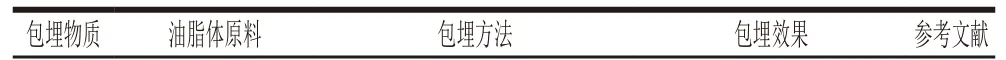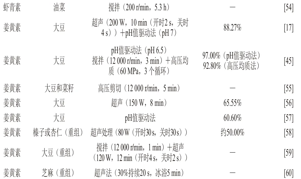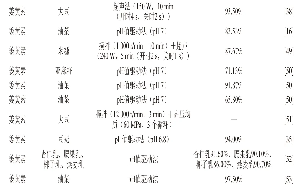 在目前已有的研究中,活性物质主要通过直接添加、溶于油、碱性溶液或者有机试剂等方式加入到油脂体乳液中。活性物质在油相中的浓度、乳液中油相和水相的比例也会对包埋效果造成影响。Sun Yufan等在大豆油脂体包埋姜黄素的研究中发现随着姜黄素在大豆油中添加量的增加(1%~30%),包埋率先升高后降低,叶黄素在大豆油中添加量为10%时包埋率达到最大,为93.5%。杨旭凤在大豆油脂体包埋姜黄素的研究中同样也发现,随着油相体积分数(5%~20%)的增加,包埋率呈现出先升高后降低的趋势(油相为10%时包埋率达到最大,为92.8%),乳液粒径逐渐增大,过量的油相无法被乳化体系包裹起来,容易通过介质流动扩散形成大的油滴。Wang Han等使用米糠油脂体包埋姜黄素的研究中,同样对比了不同油脂体体积分数(水相体积分数)对于包埋效果的影响,结果发现3%油脂体的乳液平均粒度最小且最稳定;当油脂体体积分数为1.5%时,包埋率达到最大。
