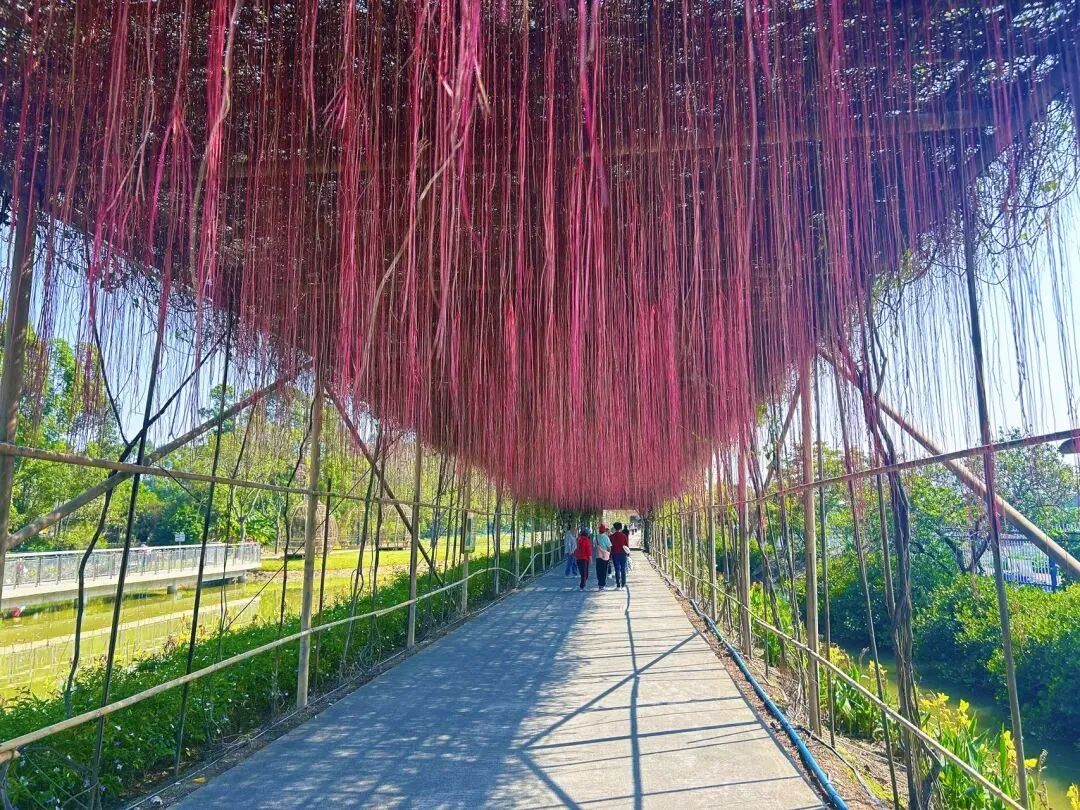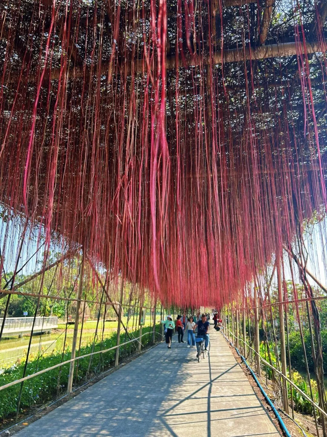 最近,如果你来位于南沙区大稳村的东涌绿道,肯定会看到这片罕见的红色幔帐!一条条细如丝绦的藤须密布如帘,从观光走廊的棚顶徐徐垂落,在春风吹拂下轻柔飘曳。