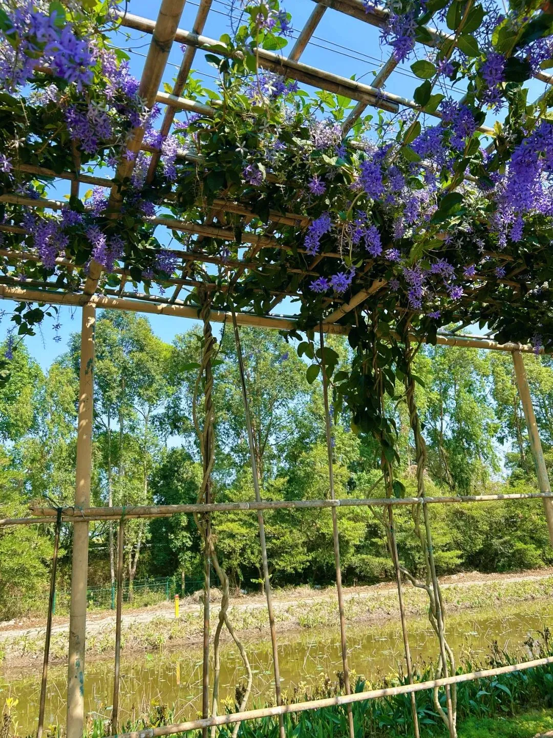 这些粉红色丝线般的植物学名叫锦屏藤,原产于美洲的热带地区,飘拂空中的红线是该植物的气根,摸上去光滑且富有弹性,简直就像天然的真丝线。几公里长的观光绿道两旁是农田和鱼塘,周边的农作物和果树正值茂盛绽花,无论是穿过“红丝线”构成的走廊,还是静坐在水塘边的木亭里,透过眼前红晕的光栅欣赏春日里广州的乡村,真是别有一番风趣。难怪这几天翻看手机朋友圈,“红韵当头”的东涌绿道常常成为大家关注的主角。你不要误以为今春东涌绿道的主色调只是红色,就在靠近大稳村博物馆和农业休闲园一侧,一段蓝花藤的绿道棚顶更是绚烂诱人。
