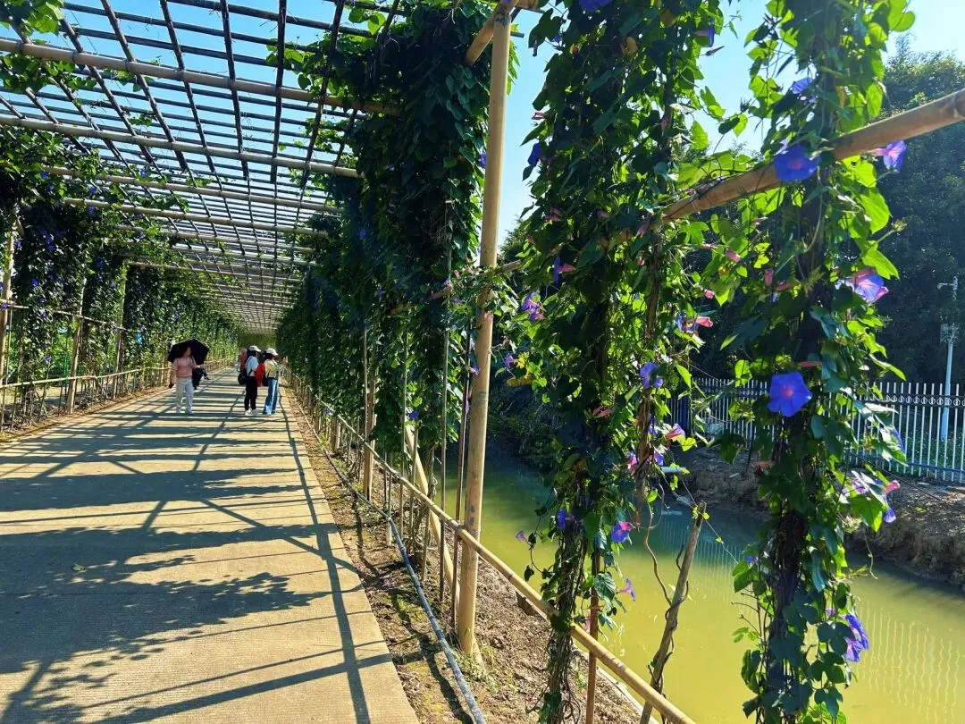这条伴依着狭长河涌的绿道绵延几公里,有些略显空旷的区域也开始被绿植包裹,只是现在有些品种还未到开花旺季,就像深蓝色的牵牛花藤,偶尔蹦出的花朵还远远不能成为绿道的主色调。