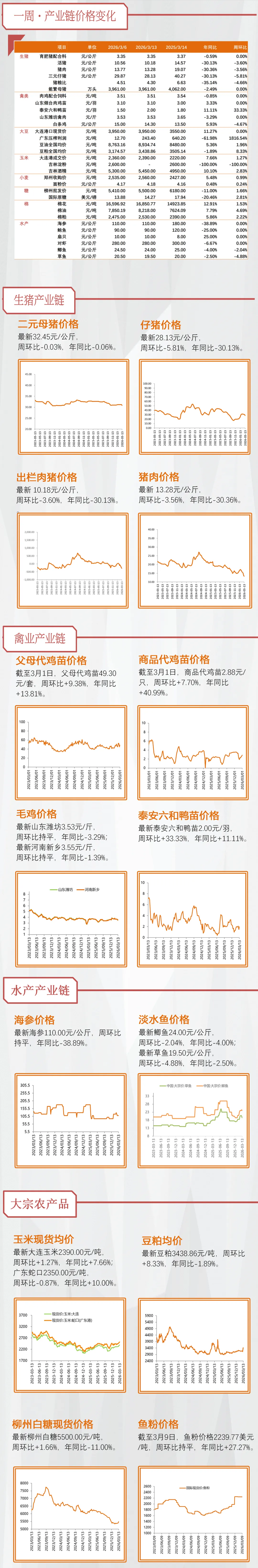 本周:①普水鱼:草鱼/罗非塘口均价环比-1.0%/+2.6%、同比+13%/-24%;②特水鱼:生鱼/黄颡/加州鲈塘口均价环比-3.4%/-1.0%/-0.7%、同比+4%/-34%/-52%;③南美白对虾:塘口均价环比-9.4%、同比-20%;本周普水鱼行情涨幅好于特水鱼。展望全年,预计普水价格同比回落,但养殖扩产支撑饲料需求;特水鱼及虾蟹受益餐饮系统性复苏及部分品种供给持续收缩,价格有望反转,带动投苗及喂料增加,虽有分化,但仍整体看好2026年水产料相对景气。④原材料鱼粉:受产量预期及原油带动大宗商品上周影响,鱼粉高位运行,秘鲁鱼粉CNF参考到岸价2350美元/吨(饲料行业信息网公众号),海大、新希望等料企上调价格,畜禽料、水产料全品类,涨幅普遍在50-100元/吨,原材料价格波动上行,头部企业定价权和盈利能力进一步凸显。此外,海外9-10亿吨饲料空间大、竞争相对温和,10+年前瞻深耕,海大模式已成功出海越南等地。继续重点推荐【海大集团】。