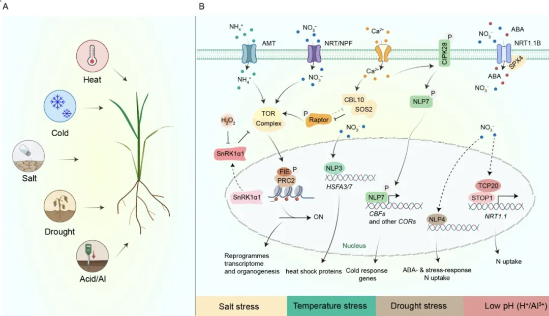 氮,不止是构成蛋白质与叶绿素的生命骨架,同时也是一种信号分子,通过不同形态间的转化,精密协调植物的生长发育与抗逆响应。作物高产高度依赖氮肥施用,而气候变化导致土壤酸化、干旱、盐碱、极端温度等非生物胁迫加剧,因此,如何协同提升作物产量、氮素利用效率与抗逆性是现代农业的核心挑战。大量研究表明,优化氮素供应能显著增强植物耐逆能力,暗示二者背后存在复杂的分子调控网络。然而,现有研究多聚焦于单一氮形态或胁迫因子,缺乏一个整合性的理论框架来回答植物如何整体感知氮状态,以及如何将其与核心胁迫信号通路进行分子整合。