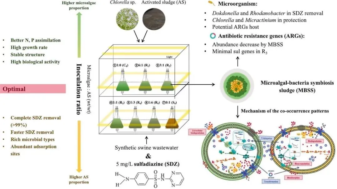 该研究针对含磺胺嘧啶(SDZ)的 swine wastewater,通过调控微藻(Chlorella sp.)与活性污泥(AS)的接种比例(1:0至0:1 wt/wt),构建微藻-细菌共生污泥(MBSS)系统。