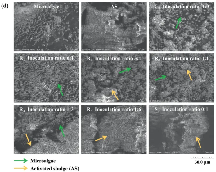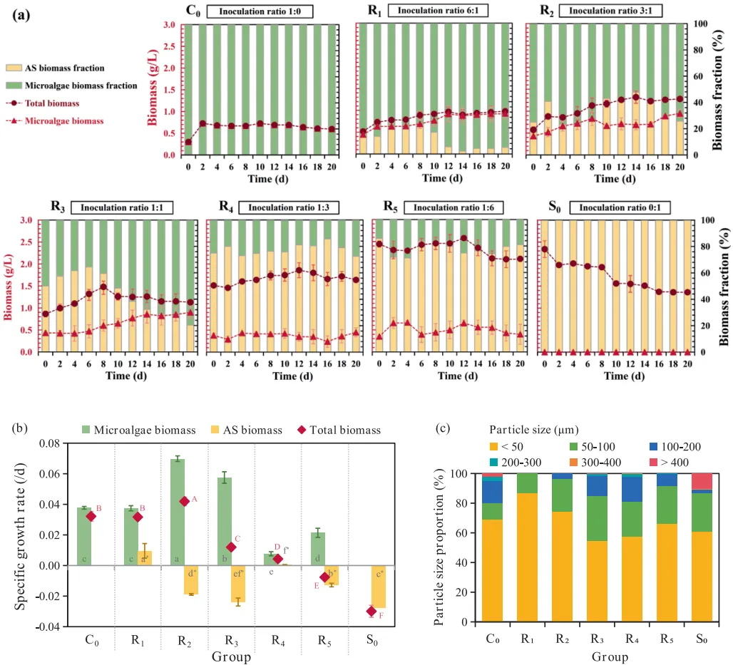 图1. 不同接种比例下MBSS的总生物量、微藻生物量、微藻与活性污泥生物量比例(a),特定生长率(b),粒径分布(c);及不同组别反应20天后微藻、活性污泥和系统的扫描电镜图像(d)