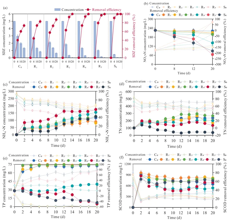图2. 不同组别中SDZ(a)、NO₃-N(b)、NH₄-N(c)、总氮(d)、总磷(e)和SCOD(f)的浓度随时间变化及去除效率。