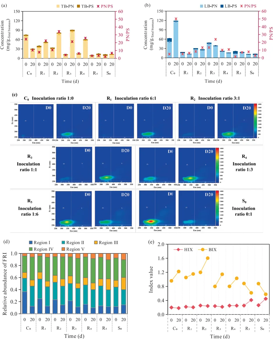 图3. 不同组别中松散结合EPS(a)和紧密结合EPS(b)的浓度及PN/PS值;不同接种比例下系统的EEM荧光光谱(c);荧光区域积分(FRI)在各区域的相对丰度(d);不同组别荧光指数值变化(e)。