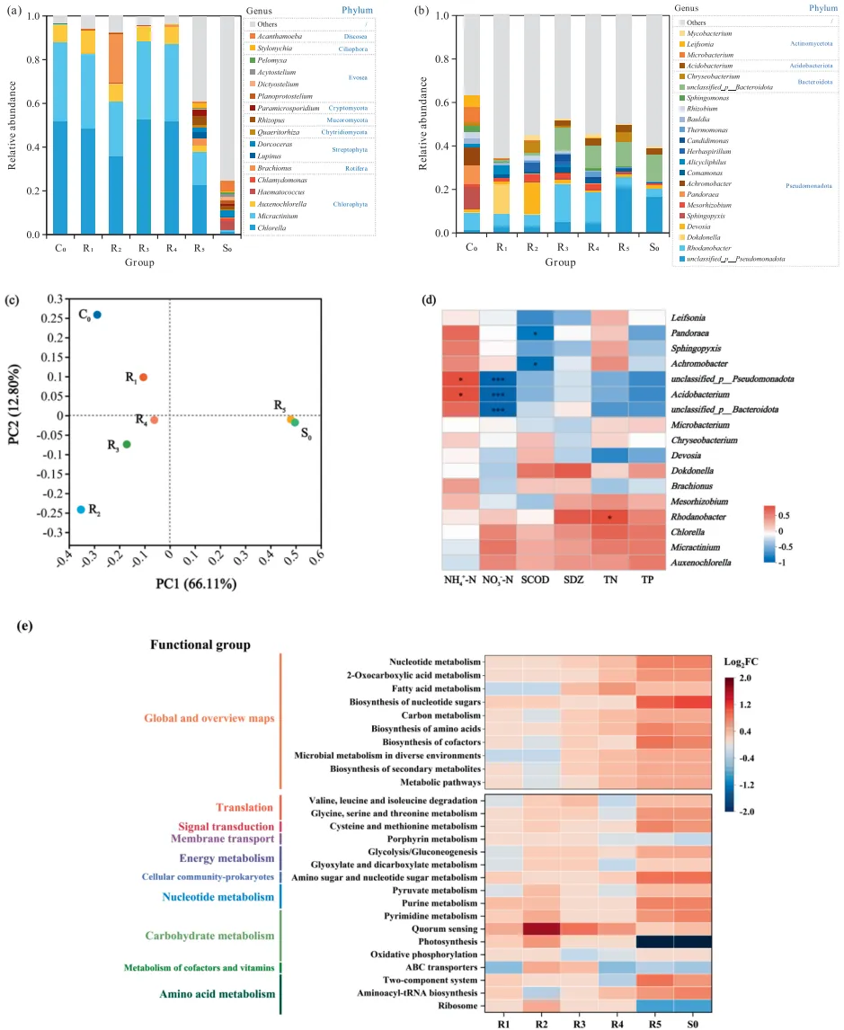 图4. 门水平和属水平真核生物(a)和原核生物(b)微生物组成相对丰度;微生物群落主坐标分析(c);KEGG Level 3功能相对丰度热图(d);不同组别微生物KEGG功能(e);KEGG Level 3前三功能微生物相对贡献(f)。