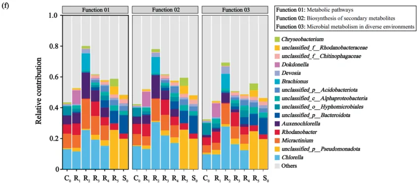 结果表明,接种比例为1:1和1:3时表现最优,SDZ去除效率高达99.8%,总氮和总磷去除率分别达33.25%和98.6%。微藻通过分泌胞外聚合物(EPS)保护微生物免受抗生素胁迫,并驱动微生物群落演替,促进Rhodanobacter和Dokdonella等降解菌富集。宏基因组分析显示,微藻接种显著降低磺胺类抗性基因(sul1和sul2)相对丰度至22.9%,有效控制抗性基因传播。