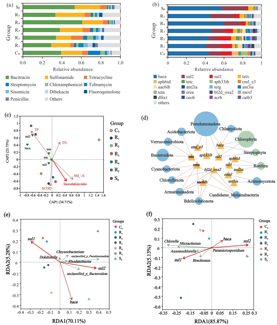 图5. 抗生素类型(a)和抗性基因(b)相对丰度;环境因子与ARGs的基于距离冗余分析(c);门水平微生物与ARGs相关性网络(d);原核生物(e)和真核生物(f)属水平主要微生物与ARGs冗余分析。