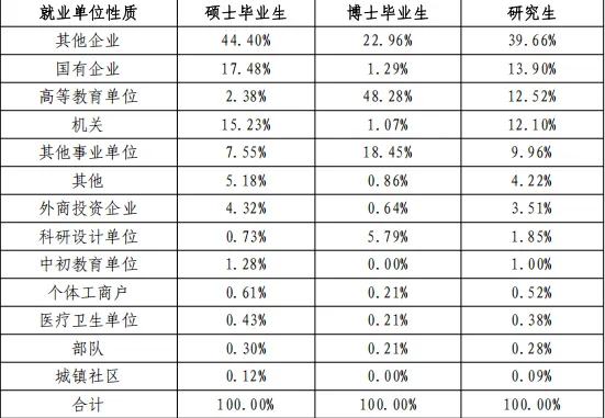 我用大白话解释一下就是:硕士生毕业,大部分去了企业,尤其是民营企业和国企;博士生毕业,超过七成进了高校、科研院所这些“体制内”单位。这就是学历层次不同带来的就业差异——博士培养的是学术人才,自然更多流向科研教学岗位。
