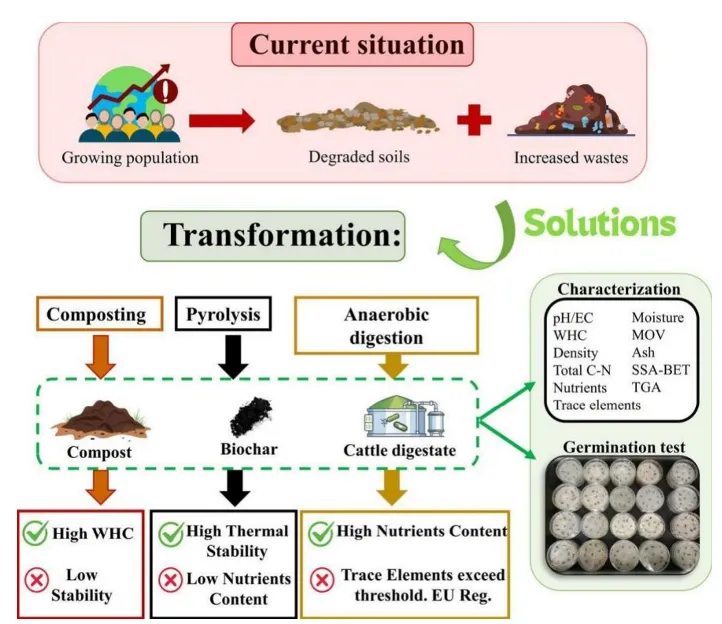 目前,现代农业正面临土壤退化、气候变异及对合成肥料过度依赖等多重挑战,与此同时,农业与畜牧业废弃物的产生量持续攀升。在此背景下,欧盟积极推动《欧洲土壤协议》,倡导将废弃物高值化转化为土壤改良剂,以促进土壤健康与资源循环。作为橄榄油、畜牧和林业生产大国,西班牙在农业废弃物资源化利用方面仍存在明显短板,亟需开展系统性高值化转化研究。本研究选取稻秆、松木片、羊毛废料、牛粪浆等典型农业与畜牧业废弃物为原料,采用堆肥、热解和中温厌氧消化三种工艺,制备堆肥、生物炭、消化液及其复配改良剂,并以市售产品为对照。通过对所有材料开展理化性质、元素组成、热重分析及痕量元素检测,结合以大麦种子为敏感指示物的种子发芽试验,系统评估各类改良剂的植物毒性。进一步深入探究原料类型与转化工艺对改良剂特性的影响机制,综合评价其农艺价值与环境风险,为农业废弃物资源化利用提供科学依据。
