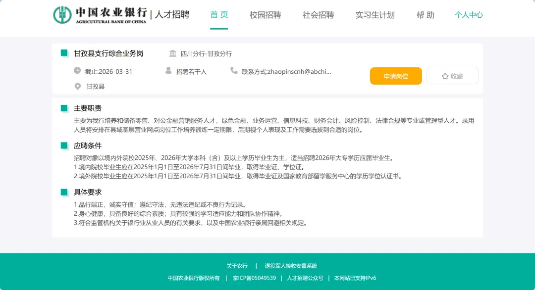 各岗位的工作职责、应聘条件和具体要求见中国农业银行招聘网站(https://career.abchina.com.cn)岗位详情。