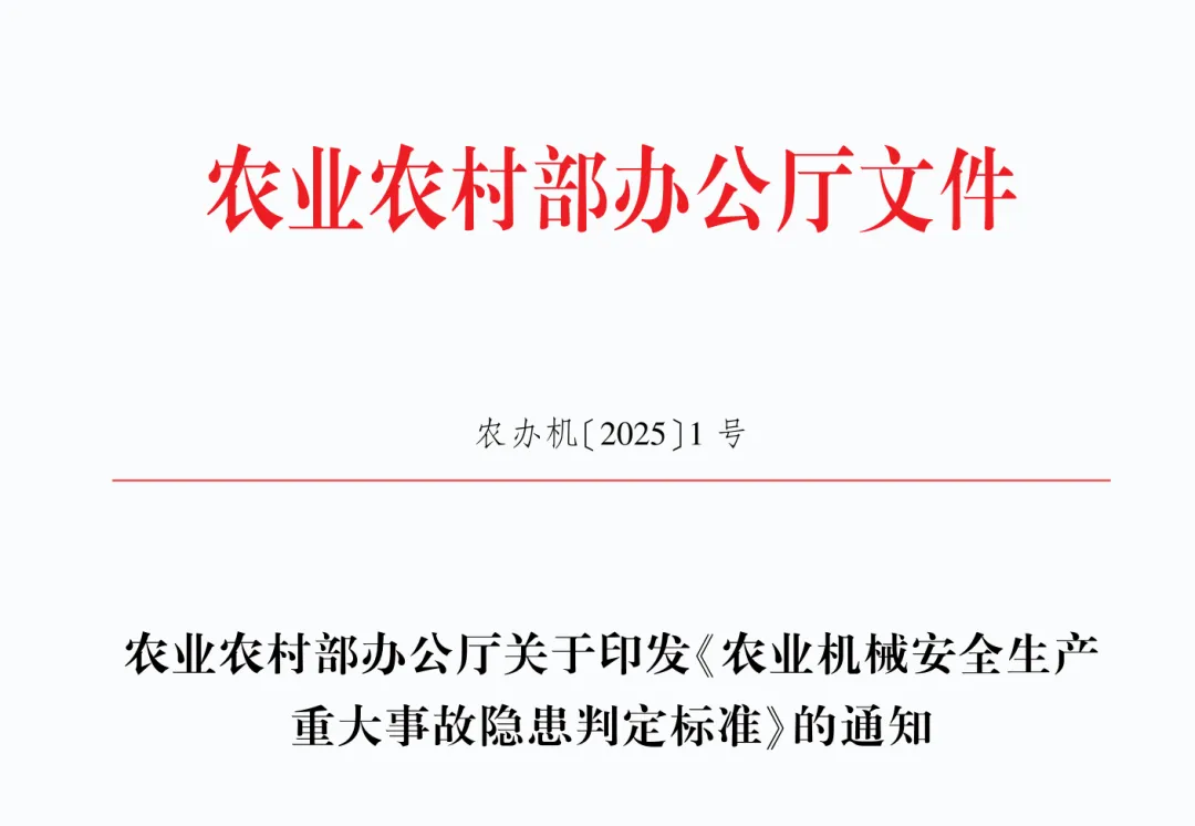为推动农业机械安全生产重大事故隐患排查整治规范化,我部制定了《农业机械安全生产重大事故隐患判定标准》,现予以印发。请各地结合实际切实做好判定标准的宣传贯彻、落地实施等工作,全力抓好农业机械重大安全风险防范化解工作,持续推进农机安全生产治理模式向事前预防转型。原《农机安全生产重大事故隐患判定标准(试行)》(农办机〔2022〕7号)同时废止。