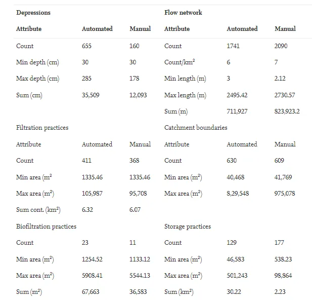 表1总结了使用两种hDEMs的结果。水力调节程序会影响 BMP布置标准。提供的数据显示人工和自动hDEM之间的凹陷数量和最大深度存在显著差异。图 1显示“人工 hDEM”只有人工验证(地面实况)真实凹陷。由于存在最佳数量的人工验证的决口线,与自动 hDEM相比,人工 hDEM 具有较少的阻碍流动(虚假汇集)。
