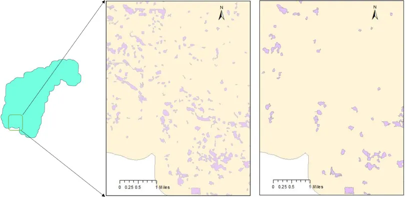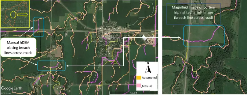 图 2:展示了自动和人工生成的hDEM如何复现研究区域的景观水文。使用两种 hDEM 生成的流量网络也使用 Minnesota DNR 水道数据集进行了验证。以蓝色矩形突出显示的部分(图 2) 表明手动“hDEM”在以连续方式表示流量网络方面更为成功,尤其是跨越道路、田野边缘和其他障碍物时。